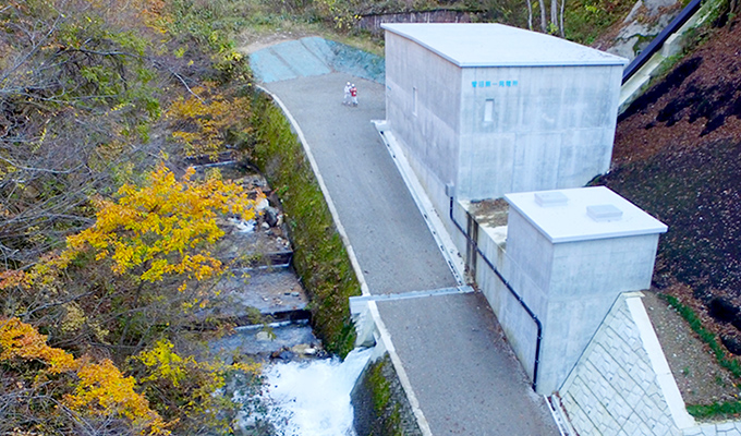 国内はもとより世界中でCO2排出量削減を含む環境対策が推進されていますが、坂本土木では、北アルプスに近い山間地の豊富な水資源を利用して環境負荷の少ない小水力発電設備による売電事業に取り組んでいます。