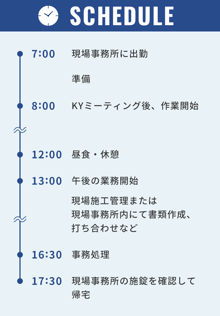 一級土木施工管理技士ですので、土木工事における測量、施工計画から工事進捗管理まで全て行ないますが、大きな現場では部分的に分担して管理することもあります。