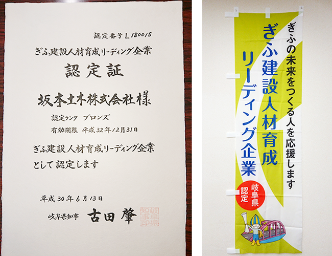 この認定制度は、岐阜県が建設業の労働環境の改善や人材の育成などに積極的な取り組みを実施する建設事業者をリーディング企業として認定するもので、当社はブロンズランクに認定されました。